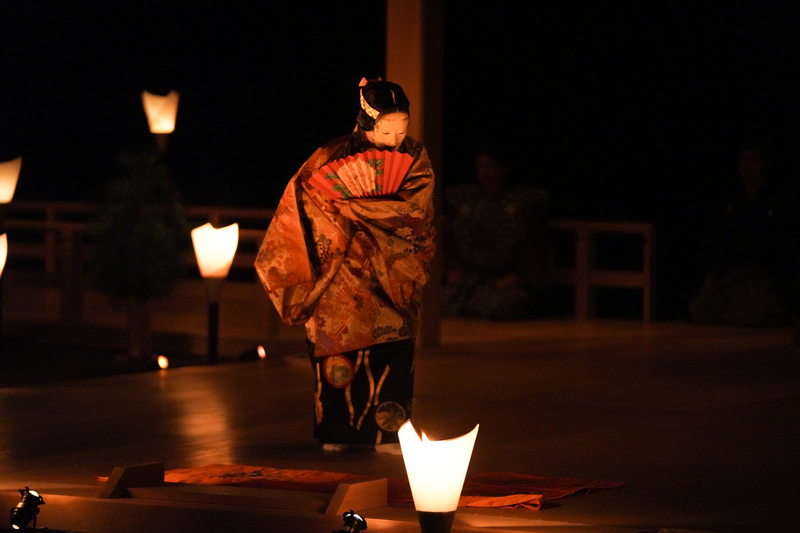 ろうそくだけだと真っ暗なのでほんの少し照明を足しますが、暗いと聴覚がいつもより冴え渡ります。謡の言葉、囃子の音、衣擦れの音など、音にも注目してご覧いただければと思います。普段とは違う特別な設えですので、ファースト葵上の方にはぴったりかと思います。