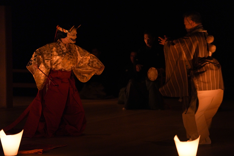 1. 巫女が交霊(霊媒者を介して霊を呼び出すこと)のために梓弓を鳴らすシーン。鼓が等間隔に聞こえてくると、生霊が吸い寄せられるようにふわーっと登場します。生霊だから消えたり現れたりするのですが、衣をかぶっている時は消えていると思ってください。