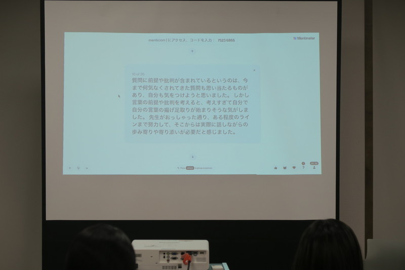 続いて感想シェア会に移ります。今回は、各自スマートフォンで感想・質問を入力するオンライン形式。「大学生はスマートフォンを持っていることを前提として、オンライン回答で進行して心苦しいと」長津さんも苦笑い。