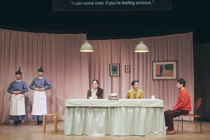 開演前、二人のメイドが客席を歩き回る。床に落ちたゴミを拾うようなしぐさや、ささやき合う会話。物語が始まる前から、舞台空間ではすでに何かが進行している。できるだけ前情報を入れずに臨んだ私は、否応なくその動きに視線を奪われた。 物語は、テル(大場みなみ)とこう(山本雅幸)という、ごくありふれたカップルの会話から始まる。しかし、その何気ないやり取りは、ほどなくして微細な「かみ合わなさ」を露わにする。妊娠という出来事をきっかけに、二人の関係性は揺らぎ始め、テルの友人(佐久間麻由)や、なぜか家にいるメイドたち(大竹このみ・青山祥子)を巻き込みながら、女性と男性、または人と人のあいだにある「わかりあえなさ」が前景化していく。
