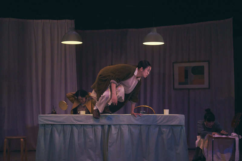 こうした関係性の揺らぎを、別の角度から照らしているのが、メイドたちの存在である。テルとこうの関係性に引き寄せられがちな視線の背後で、彼女たちは料理や掃除といった家庭内の再生産労働を体現する存在として佇んでいる。物語中盤まで、こうが彼女たちの存在に気付かないという設定は、それらの労働がいかに不可視化されてきたかを端的に示している。開演前、客席を動き回るメイドたちに向けられた観客の視線が、ここで遅れて回収される。家父長制的な役割分担に順応してきた先輩メイドと、ルールそのものに違和感を覚える新人メイド。その関係は、「疑問を持つことが許されず環境に適応してきた態度」と、「疑問を抱かずにはいられない態度」とのあいだに横たわる、世代的な断絶を浮かび上がらせる。