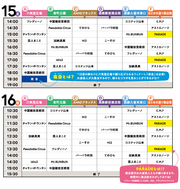 ※雨天時は演目内容や場所、スケジュールが変わる場合があります。最新情報はインフォメーションへ。